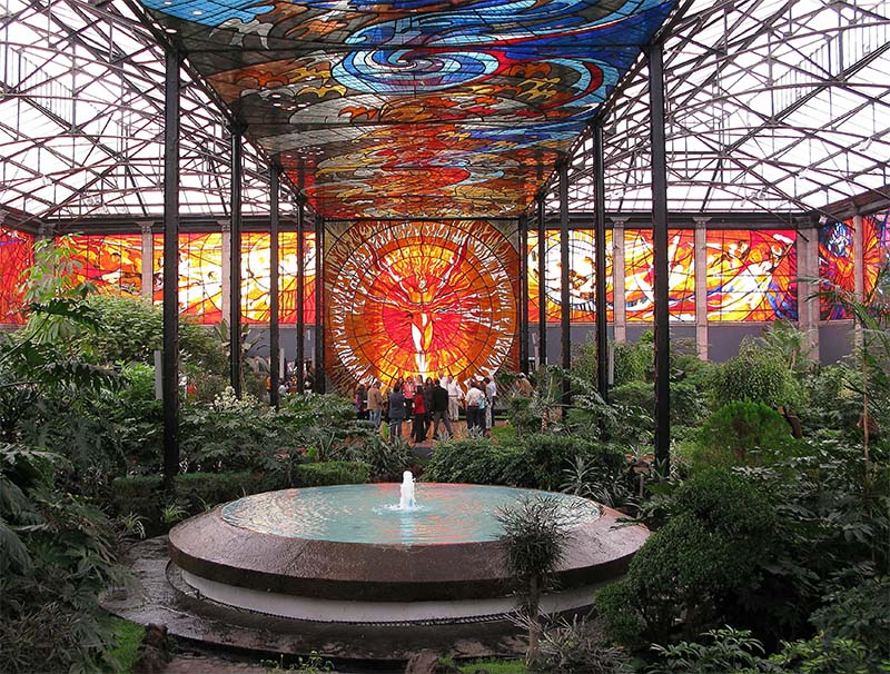 Mientras avanzan por el Cosmovitral, podrán ver el jardín botánico que está dentro del mismo espacio, con plantas de todo tipo. Hay cactus, suculentas, helechos, palmeras y plantas tropicales que llaman mucho la atención. También pueden encontrar orquídeas, bromelias y flores como el hibiscus, además de algunas especies poco comunes como el ginkgo biloba, conocido como un “fósil viviente” por existir desde hace millones de años, lo que siempre da pie a una buena plática con los niños.