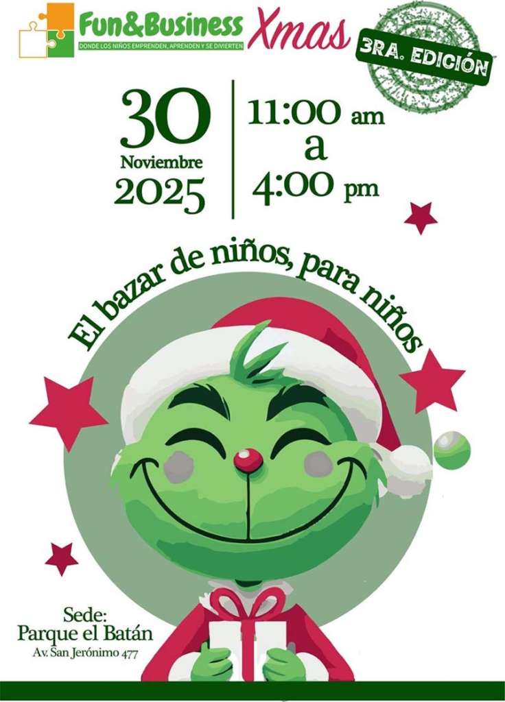 Este 30 de noviembre, de 11:00 a 16:00 h, algunos de nuestros niños del Piaget se unirán a la 3ra edición del Bazar de Niños Fun & Business XMAS en el Parque El Batán, Jardín Oasis. Más de 100 niños de distintas escuelas se convertirán en pequeños emprendedores y venderán todo tipo de productos: pijamas, pantuflas, velas, papelería kawaii, cuadros, galletas, aguas de sabor, Play Doh, juguetes didácticos, calcetines de Navidad y ropita de elfos, ¡hecha por ellos y también por algunos proveedores!