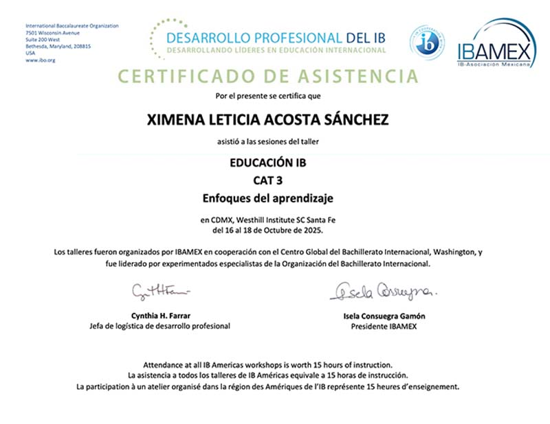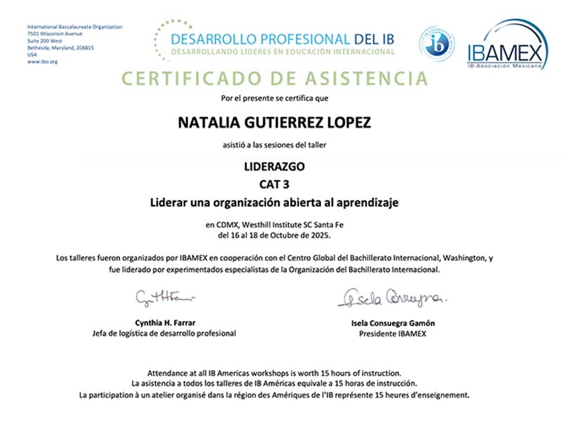Miss Xime participó en el taller sobre Enfoque del aprendizaje y miss Nat en Liderar una organización abierta al aprendizaje. Ambas recibieron un reconocimiento por su participación y compromiso con la mejora continua, reafirmando el espíritu IB que nos caracteriza.